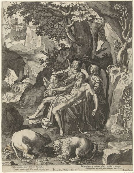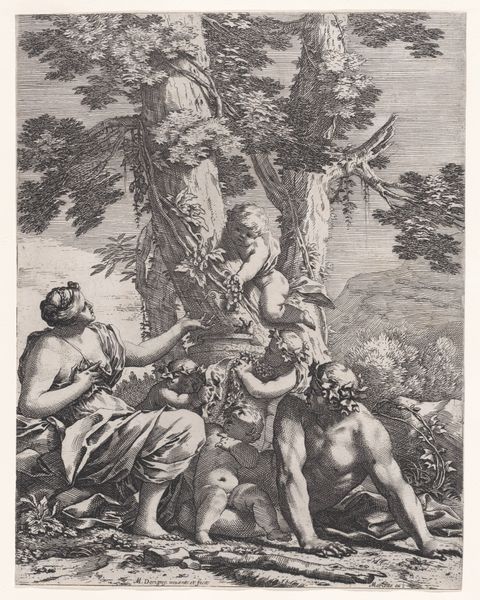 Curator: Here we have J.F. Clemens' print, "Niels Klim hyldes af Qvamiterne, der bringer ham gaver og knæler for ham," created between 1786 and 1788. It's currently held at the SMK, the National Gallery of Denmark. Editor: Whoa, talk about a welcome party! The scale seems intimate, like a secretive, forest ritual. There’s definitely a strange kind of reverence at play. A bit awkward maybe, from Klim's expression. Curator: The etching captures a scene of intercultural exchange—though, to use a postcolonial lens, perhaps one should also add coercion—taken from Ludvig Holberg's satirical novel, *Niels Klim's Underground Travels*. Clemens here visualizes Klim's arrival among the Quamites, who treat him as a god. The composition and this almost exaggerated obsequiousness invites questions about power, representation, and cultural relativism. Editor: It reminds me a little bit of illustrations in old fairy tale books...that sketchy vibe with hints of mystery. Clemens renders Klim so detached from the experience. Makes you wonder what he’s really thinking. It looks like, "please stop". He seems incredibly uncomfortable in what you called the 'visualized intercultural exchange' situation, right? Curator: Exactly. I wonder, from a gender perspective, what that says about these interactions, even allegorically speaking, as some people knee before the man. Also note the presents: they give Klim what? Apples. Why those, I ask myself. Does the novel explain that, too? Or does it reflect ideas on sin, lust, life...knowledge, you know...The male nude adds another interesting layer to this power dynamic. Editor: It all has this understated irony that somehow feels very modern even if Clemens lived two centuries ago! The textures of the forest...the bare flesh...it's a delicious contrast. So, it’s a great picture, because once you are familiar with the cultural baggage, the picture becomes extremely relevant. Curator: Very well said, because without the information behind the artwork, you cannot really dig deep into the social narratives that the artist presents. It forces us to really reconsider what we think of "encounters," so-called civility, and history. Editor: Totally! Makes you question everything, including whether or not to accept strange gifts from nude forest people. Just saying...