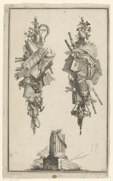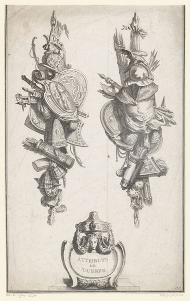 Pierre François Tardieu made this etching, 'Trophies with Flags', using the intaglio process. This printmaking technique involves incising an image into a metal plate, inking the plate, and then transferring the image to paper under high pressure. The material qualities of the print – its fineness of line and delicate tonal range – stem directly from this method, which allowed Tardieu to render the textures of the military regalia with precision. Note the woven baskets, furled flags, and gleaming weaponry, all suggestive of the spoils of war. Etchings like this one were often made in multiples, to circulate widely. In this respect, they parallel the military culture that is their subject. Both are about large-scale, coordinated actions, requiring many hands to achieve their effects. The relatively low cost of prints like this, as compared to unique works of art, put them within the reach of a broad audience, making them a potent vehicle for celebrating nationalistic sentiment.