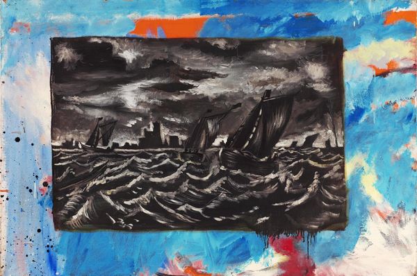 Curator: Richard Hambleton’s "Burning Merit," painted in 1985 using mixed media, primarily acrylic paint, captures a scene of intense drama. What strikes you initially about this work? Editor: The visual impact is undeniable. It feels chaotic, almost apocalyptic. A ship ablaze, set against a turbulent sky... it evokes a real sense of disaster and immediacy. Curator: Hambleton emerged from the vibrant New York art scene of the 1980s. His art often grapples with themes of urban decay, social anxieties, and the pervasive sense of unease in a rapidly changing world. Given this, what cultural narratives do you see reflected in "Burning Merit"? Editor: Well, the burning ship itself carries symbolic weight. Fire often represents destruction, but also purification. In the context of the '80s, amidst economic anxieties and the looming AIDS crisis, I wonder if the burning ship becomes a metaphor for a society teetering on the edge of self-destruction or maybe burning away the status quo, suggested also in the title? Curator: The name “Merit” itself is interesting, maybe it's ironic. What would be considered “meritorious” in the face of such destruction? And what of that word scrawled at the bottom—could it allude to ideas of worth and moral justification amid the surrounding turmoil? Editor: The prominence of that horizon and ship speaks volumes, I think. In so many cultures, water represents the unconscious, the source of life and potential danger. A ship is about transit, maybe suggesting an uncertain passage from one state to another—burning all the way through... Curator: Exactly. This imagery resonates powerfully with the socio-political anxieties of the time. Furthermore, Hambleton's stylistic choices, rooted in Abstract Expressionism, also contribute to its impact. The loose brushstrokes and dramatic use of light and shadow heighten the emotional intensity, amplifying the sense of impending doom and moral uncertainty. Editor: It also reflects enduring concerns of progress and catastrophe, reminding us how civilizations always risk collapsing despite aspirations towards "merit." Curator: That's a brilliant observation. Thank you! Editor: My pleasure! This painting truly makes one reflect upon what remains when all seems lost.