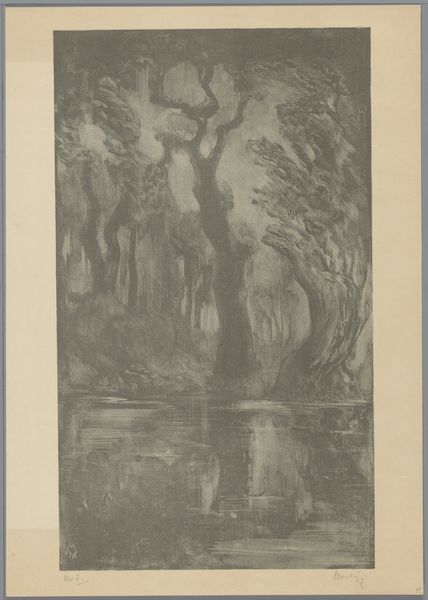 Curator: We’re looking at Simon Moulijn’s 1923 pencil and graphite drawing titled "Wilg bij sloot," which translates to Willow by Ditch, currently residing here at the Rijksmuseum. Editor: There’s a hushed quality to this piece. The limited palette really accentuates the stark, almost lonely feel of the willow against the water. It gives an austere emotional quality, and the pencilwork has a really interesting tactile energy, almost like you can feel the bark. Curator: Indeed, the focus here isn't necessarily on replicating the scene, but rather interpreting the light and the texture through expressive strokes. This was a common sentiment with the Hague School artists that he was influenced by. They were interested in everyday subjects from Dutch life. This is less a portrait of nature than an exploration of mood, specifically a melancholy one. Editor: That focus on a ‘sense of place’ really comes through, and knowing its placement in the Hague School tradition illuminates some of that reserved quality you mentioned. In the 1920s, after the devastation of World War I, you see a lot of artists trying to grapple with the changing social fabric. Do you think Moulijn was trying to capture some essence of Dutch resilience and how it connected to landscape in the face of upheaval? Curator: That’s a thoughtful reading. Moulijn's works are tied to his commitment to represent working-class people. And even here, in what appears to be a simple landscape, there's a reminder of the labor required to manage waterways and maintain this natural landscape. So the work is silent but, in reality, quite political. Editor: Yes, it does underscore how constructed our idea of a "natural" scene actually is. This controlled and ordered view is inherently political, then. It speaks to how power operates even within something that seems still and serene, which I find a little unnerving, but very much thought-provoking. Curator: Absolutely, there’s something subtly powerful about this quiet observation. I will see this landscape from a new vantage point going forward. Editor: And it reminds me of how landscape isn't merely background but actively shapes us and is shaped by the social and historical currents surrounding it. It’s been so informative speaking with you today.