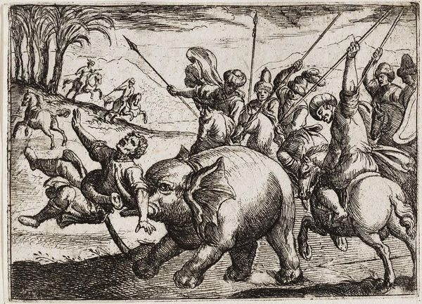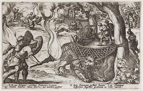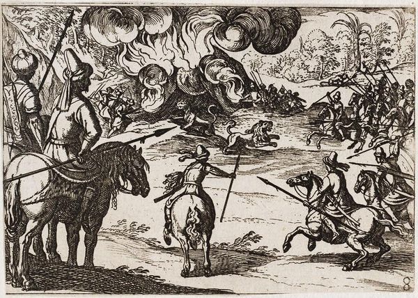 Curator: This is Antonio Tempesta’s “Deer Hunt,” currently residing at the Harvard Art Museums. What strikes you first about this piece? Editor: The chaos! The scene is teeming with figures, both human and animal, caught in a moment of intense action. It feels… predatory. Curator: The hunt is an ancient symbol, often associated with power, dominance, and the cyclical nature of life and death. What narratives do you see unfolding here? Editor: I see a stark power dynamic. The hunters, mounted and armed, contrast sharply with the vulnerable deer. It speaks to human control over the natural world, and raises questions about exploitation and violence. Curator: Indeed. Tempesta’s detailed engraving style amplifies the scene's drama. Consider the smoke billowing from the fire and the figures’ dynamic poses – they evoke a sense of urgency and primal energy. Editor: It's a compelling, if unsettling, depiction of humanity's relationship with nature. It forces us to confront uncomfortable truths about our own role in this ongoing drama. Curator: A visceral representation, for sure. It leaves me with the persistent echoes of the hunt resonating within me. Editor: The image feels so relevant today. It reminds us of the consequences of unchecked power and environmental exploitation.