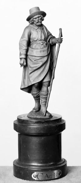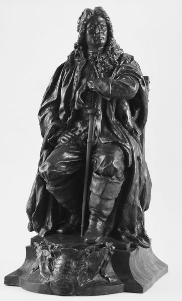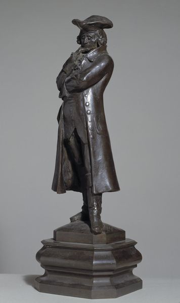 Curator: Standing before us, we have John Quincy Adams Ward’s bronze sculpture, "William Shakespeare," conceived between 1870 and 1911. Editor: It's imposing, isn’t it? There's a heaviness, both literal and figurative, about the texture of the bronze and Shakespeare’s serious expression. It makes me feel reflective. Curator: Ward created several casts of this work, a testament to Shakespeare’s enduring cultural relevance, particularly in America during the late 19th century. Think of the burgeoning theater scene and the romanticism surrounding the idea of the literary genius. Editor: The realism is striking. Look at the precise details of the clothing – the folds, the buttons and seams. But beyond accuracy, how do these textures create the illusion of fabric and shape our understanding of his personification? It's incredible craftsmanship. Curator: This particular representation tells a story. Placing such a monumental statue in prominent locations like Central Park certainly contributed to canonizing Shakespeare within American intellectual life, a conscious effort to shape cultural identity. Editor: I notice the placement of his left hand. It holds what appears to be a manuscript, yet it's also open, suggestive. Does this direct the gaze to ponder what knowledge is captured there and how it might spill onto us? Curator: Exactly, these statues were tools of cultural production, shaping the collective memory. Commissioned by wealthy patrons, institutions and later reproduced, their function was clear, to inspire and legitimize certain cultural values. Editor: It's an excellent piece to experience materially. Considering the interplay of light and shadow, the smooth and rough bronze surfaces and even considering its volumetric presence creates new possibilities for reflecting upon the human form. Curator: Precisely, its influence resonates even today, continuing the cycle of creating cultural icons. Editor: An intriguing conversation about an intriguing statue! It reveals more secrets the more one reflects on its textures and composition.