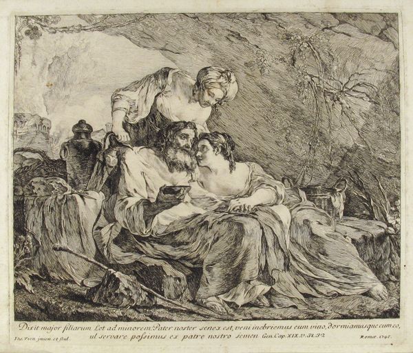 Editor: This is "Rest in Egypt" by Adam von Bartsch. It's a print, and the figures seem huddled and exhausted. How do you interpret this work in the context of its time? Curator: Consider the role of religious imagery in 18th-century Europe. Prints like this circulated widely, shaping popular understanding of biblical stories. Notice how Bartsch emphasizes the family's vulnerability. Editor: So, it's not just a depiction, but also a commentary on their social status? Curator: Precisely. The print engages with the politics of representation, inviting empathy for those displaced and seeking refuge. What do you make of the donkey? Editor: It adds to the sense of humble travel, a real contrast to more idealized depictions of the Holy Family. It shows the reality of their journey. Curator: Reflecting on this print, we see how art can humanize even the most iconic narratives, prompting viewers to consider the socio-political dimensions of faith.