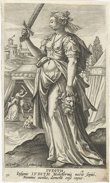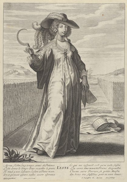 Curator: The piece before us, titled "Voorzichtigheid(?)," which translates to "Caution(?)," is an engraving created in 1727 by Bernard Picart, presently housed at the Rijksmuseum. Editor: My first thought is, well, it feels staged. The figure looms large against a somewhat bustling landscape, but the tones are very uniform; even, almost lifeless. Curator: I agree with the staging, given the allegorical nature of the work, the landscape acts almost like a backdrop for the figure of Prudence, doesn't it? If you consider printmaking as a business, which it definitely was in the 18th century, these prints became very lucrative to meet market demand. Picart was smart in recognizing this demand, organizing large scale print productions by essentially making "art factories." Editor: So the "lifelessness" could stem from the modes of production! This aligns perfectly with considering the intersection of art, labor, and economics. But it does pose some interesting questions regarding his other pieces of work. Was he aware of what the mechanization of art implied? Also, I'm curious to explore how it reflected the changing social values and economic structures. Curator: I suspect so. Although in its current form, the engraving appears flat. If we were to go back to the means of production we could consider its relationship to graphic design or perhaps the influence on industrial design in a broad sense. As engraving, it’s dependent upon an artisanal labor that produces an object intended for larger consumption. What are your thoughts about that Cupid-like figure holding a banner that floats up by Prudentia? Editor: Definitely an angel. I think, beyond the religious associations of course, it is crucial to look at the iconographic and sociopolitical impact, the power dynamics they reproduce by centering a Western ideal, as it all adds a further layer to its reading as a symbolic project. The visual vocabulary that perpetuates those paradigms. Curator: Precisely. That helps in framing this work and opens avenues for further examination of not only Picart's artistic processes, but also its implications in the history of visual representation. Editor: Yes, and acknowledging the inherent power dynamics and social messages intertwined within art, hopefully leading to critical conversations.