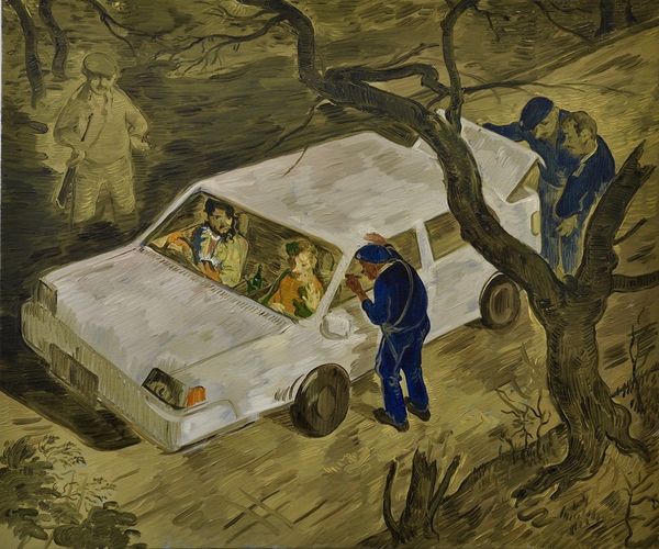 Editor: We’re looking at Salman Toor’s "Car Boys" from 2019, done in oil and acrylic. It's quite an arresting scene: a car full of people seemingly pulled over by police in a somewhat overgrown landscape. The atmosphere is unsettling, but there’s also something oddly dreamlike about the execution. What strikes you when you look at it? Curator: It's interesting that you picked up on that dreamlike quality. For me, that links directly to the socio-political undercurrents in Toor's work. Think about who gets depicted in what ways, and who holds the power in these kinds of everyday encounters. This seemingly routine traffic stop hints at broader issues of surveillance, prejudice, and the anxieties faced by marginalized communities, particularly within the West. Do you notice how the figures' expressions contribute to this reading? Editor: Yes, the slightly apprehensive, almost defiant looks on the faces in the car versus the somewhat detached, authoritative postures of the officers. But what about the setting? It doesn’t feel particularly American or European, does it? Curator: Exactly. Toor often blends settings and identities, refusing easy categorization. This "anywhere" quality amplifies the universality of the themes. Where does one feel safe, and under what conditions? Are the officers there to protect and serve, or to impose a certain societal norm? The figures here are a statement on a particular form of belonging. Editor: So the seemingly casual genre scene actually becomes a potent comment on power dynamics and the feeling of being watched, and questioned... Curator: Precisely. Toor uses familiar visual language to ask difficult, pertinent questions about the society we inhabit. Editor: That’s made me see it in a completely different light, highlighting how setting can contribute to the tone. I'll remember that! Curator: I am very glad I helped shed a light for you. It also highlights the responsibility and power we wield as interpreters.