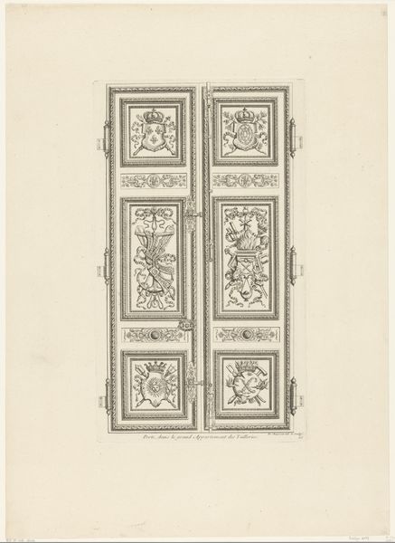 Editor: Here we have "Four Designs for Decorative Panels," created sometime between 1830 and 1897 by Jules-Edmond-Charles Lachaise, rendered with pencil, print, and paper. There’s a formality to these drawings, but the details are so delicate. How would you interpret this work, and what aspects stand out to you? Curator: Oh, this brings me back! Looking at these designs, I see more than just decorative elements; I sense the ambition of a craftsman dreaming of grandeur, perhaps constrained by the realities of his time, channeling all that creative energy into these miniature worlds. What do you feel when you look at the door design, Editor? Does it invite you in, or does it keep you out? Editor: I think it wants to keep people out! It seems less inviting than those vertical floral panels, with their sort of cascading sense of organic growth and fanciful avian creatures. Curator: Precisely! Think about the society this artist lived in. The details reflect more than decoration; they speak to status, power, and the controlled presentation of self. I find myself pondering what daydreams and unfulfilled projects he poured into these meticulous lines. And aren’t we all, in some ways, just a collection of unrealized dreams etched onto paper? Editor: That's such a poignant way to put it. Now, noticing the repetition and symmetry makes me appreciate the underlying structure beneath the whimsy. Curator: Indeed! And did you notice the small variations, like the barely-there asymmetries—those whispers of imperfection that hint at the hand of the artist, fighting against the rigid expectations of design? It's those nuances where the real magic hides, a rebellion in the details! Editor: I hadn’t considered it like that. Now it feels less like a blueprint and more like a story being told. Curator: Exactly! Each panel is a chapter, and together they whisper a tale of artistry, longing, and the silent conversation between an artist and their world. I love that these are but a small portal to enter into such rich reflections.