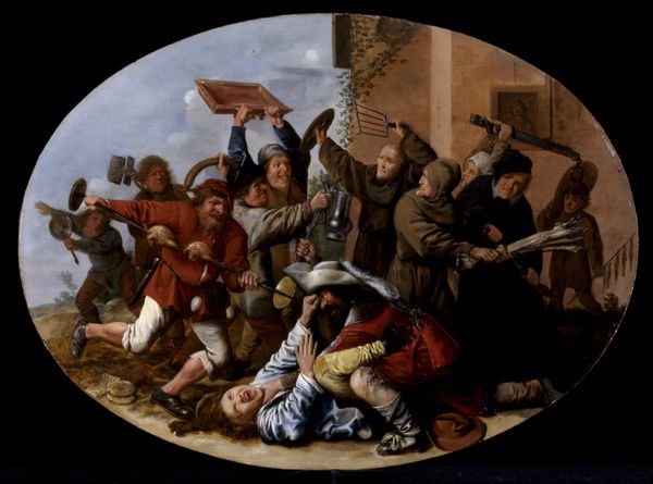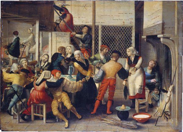 Editor: We're looking at "Gathering of Gamblers with Hurdy-Gurdy Player," an oil on canvas from around 1660, by an unknown artist. It's at the Minneapolis Institute of Art. There's this smoky, muted quality to it, like a scene from a play. Everyone is intensely focused on something happening at the table. What do you see happening here, looking at it from a historical perspective? Curator: It strikes me as a carefully staged representation of social life. Genre paintings like this one, very popular in the 17th century, give us insight into the values and anxieties of the time. It appears like people from varied societal standings are gambling together in a space— how does this inform ideas around equality at the time, and the politics of entertainment? What are your initial thoughts on the subject of entertainment at that point in time, seeing this painting? Editor: It makes me wonder who commissioned this. It seems like they’re trying to say something about gambling or social interaction, but it's ambiguous. I'm not quite sure what message is supposed to come through from a work of art depicting people engaged in recreational gaming activities like card playing. The little kid on the right, chewing at something, he looks quite mischievous... Curator: Precisely. That boy and the hurdy-gurdy player hint at the darker side of leisure. Think about it – gambling was tied to debates on morality, class, and the use of time. It wasn’t just fun, it reflected anxieties about social order. The painting seems interested in communicating an underlying idea on this aspect of seventeenth-century culture, where you find games mixed up with more complex problems in day to day living, isn't it? Editor: Absolutely, this is getting me thinking. There is definitely a coded conversation happening here around morality, entertainment, and hierarchy. I never expected something so "simple" could actually hide so many possible implications about the socio-political status of that period of time. Curator: And that, in essence, highlights the cultural work this painting performs. It’s not just a window onto the past, but an active participant in shaping its viewers understanding of gambling, wealth, and the nature of the Dutch Golden Age.