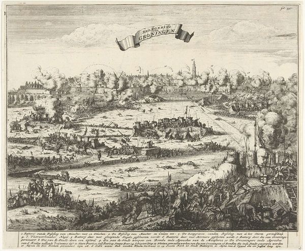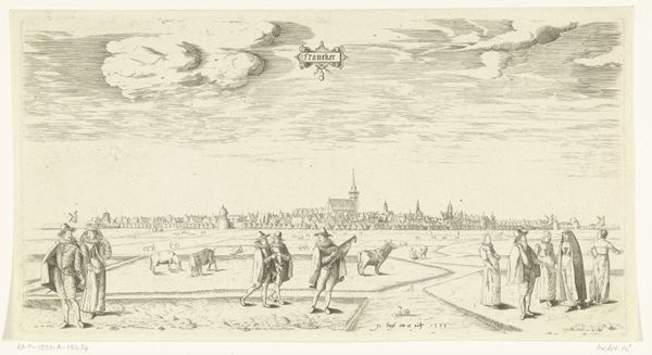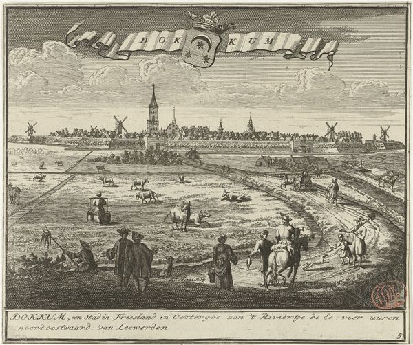 Jacob Folkema created this print titled 'Gezicht op Workum' sometime between his birth in 1692 and death in 1767. The image offers a panoramic view of Workum, a city in Friesland, a northern province of the Netherlands. Produced during the Dutch Golden Age, a period marked by unprecedented economic prosperity and cultural flourishing, this print encapsulates the era’s complex relationship with land and labor. While the landscape appears idyllic, the figures toiling in the fields remind us of the labor which sustained this prosperity. We see workers harvesting crops, their bent postures conveying the physical demands of agricultural work. This image offers a glimpse into the lives of the working class, whose contributions were essential to the economic success of the Dutch Republic. The composition subtly nods towards the social hierarchies of the time, contrasting the detailed depiction of the town with the more generalized portrayal of the workers in the fields. As you consider this print, reflect on how it invites us to consider the relationship between land, labor, and the social structures that shape our understanding of progress and prosperity.