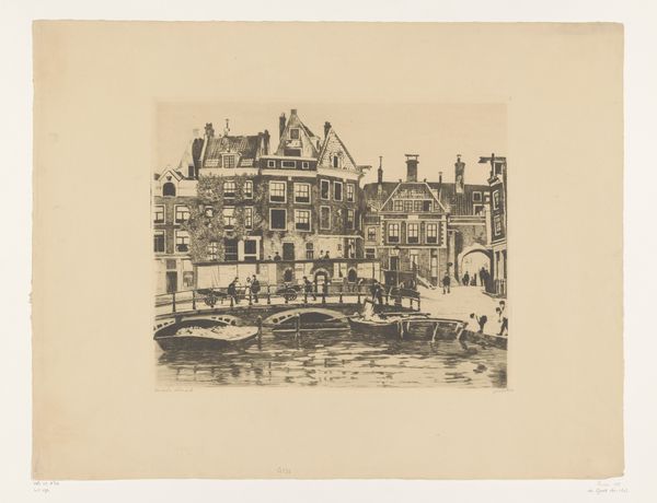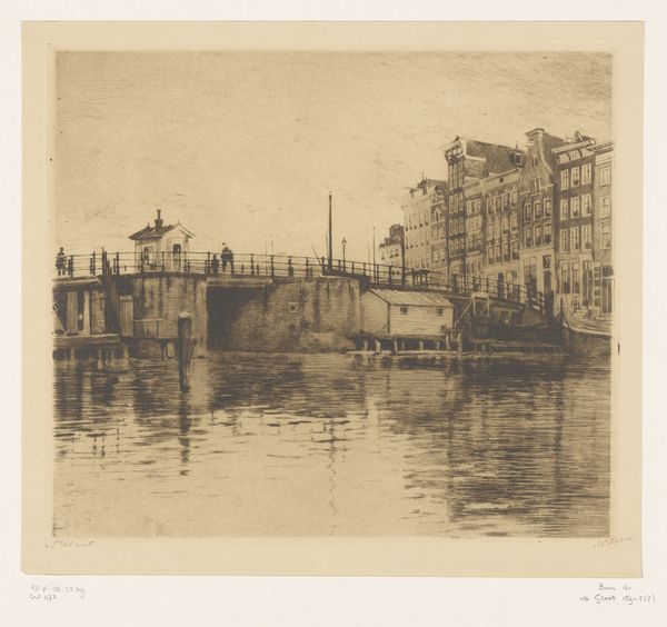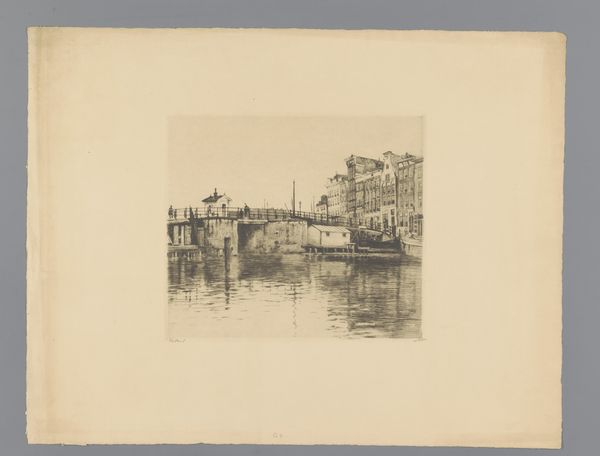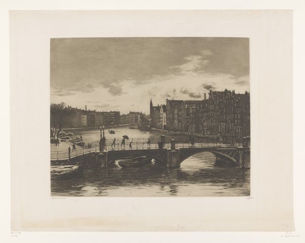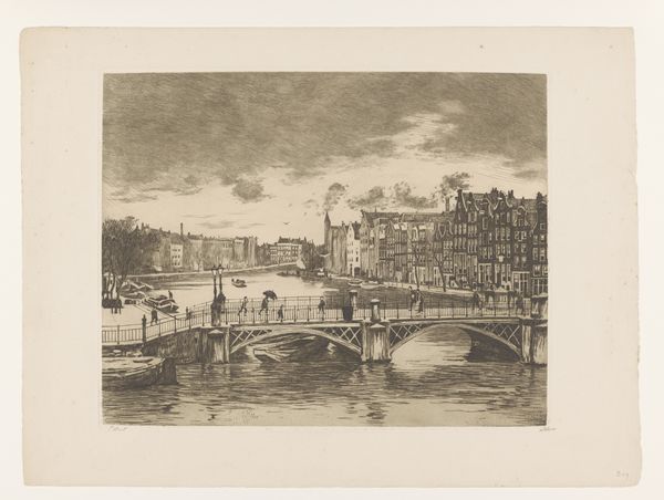 Willem Witsen made this etching, "Gezicht op de Kraansluis in Amsterdam," capturing a view of Amsterdam's canal and bridge. Witsen belonged to a group of Dutch artists at the end of the 19th century who embraced a style known as Impressionism, focusing on the everyday. In this quiet yet bustling scene, the artist captures not just a place, but a moment in time, with figures casually crossing the bridge. The bridge, more than just a structure, becomes a connector of lives and stories. Consider how Witsen's choice to depict an ordinary scene elevates the mundane to something worthy of artistic attention. As you look closer, imagine the lives of the people crossing the bridge, their stories interwoven with the city's history. Notice how the artist prompts us to find beauty in the everyday. The emotional resonance of this piece lies in its ability to connect us to a specific time and place, reminding us of the shared human experience that transcends time.