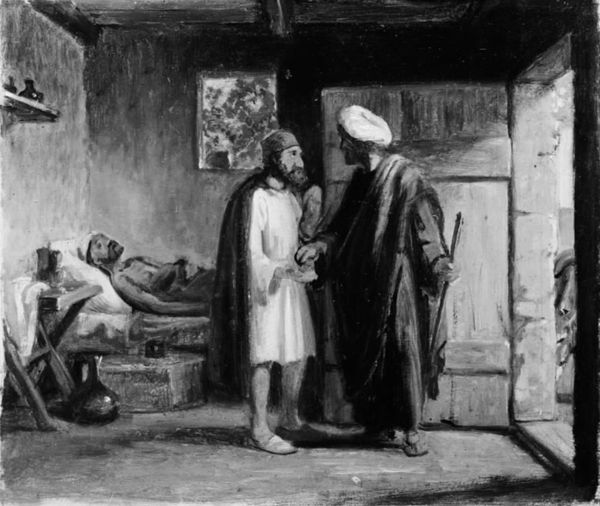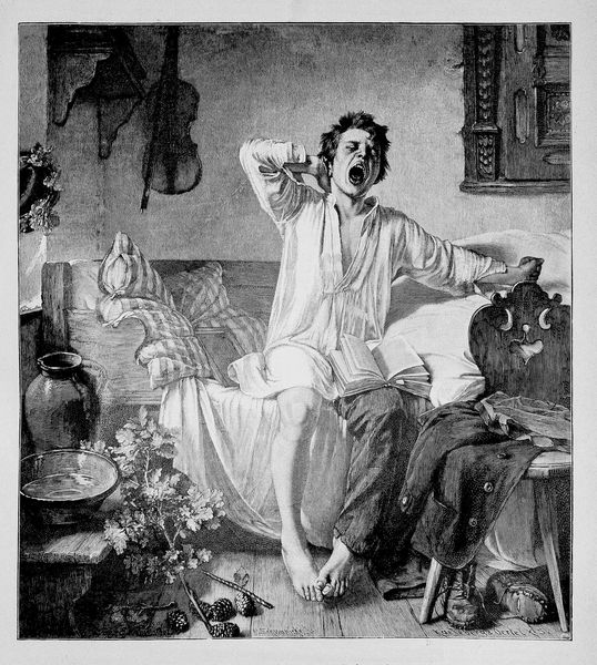 Toby Edward Rosenthal’s "Genesung" seems to be painted with oil on canvas; a traditional medium used to render detailed scenes. Rosenthal’s work focuses on the interior setting, highlighting the family’s living space and the clothes and instruments present, hinting at the social context. The violin embodies artistic expression, and implies leisure or even privilege. The setting however suggests a humbler lifestyle. The attention to the fabrics, wooden elements, and everyday objects subtly hints at the value placed on skilled craft and artisanship within the depicted community. The visible brushstrokes and attention to detail celebrate craftsmanship and reflect the artist's skilled execution, inviting viewers to appreciate the creative process involved in the painting’s making. It prompts us to consider the amount of time, labor, and expertise necessary for creating such work. By focusing on the material culture within the painting, we get to see the artist elevating the value of everyday life and skilled traditions alongside fine art.