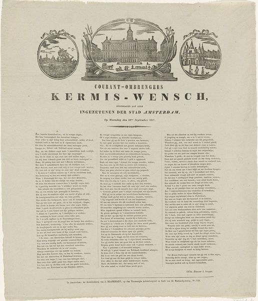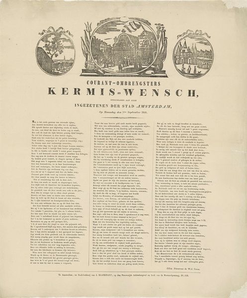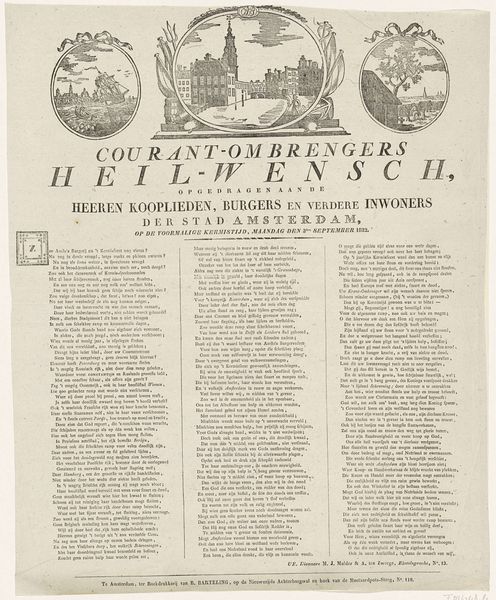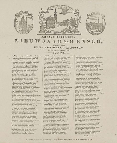 This broadside is titled "New Year's Greetings from the Amsterdam Newspaper Carriers for the Year 1858." Printed anonymously, this document provides a fascinating glimpse into the cultural fabric of 19th-century Amsterdam. Newspaper carriers, who were often working-class individuals, would distribute these greetings to their customers as a way to express gratitude and solicit tips for the new year. This tradition highlights the intersection of commerce and community during this period. The broadside itself is adorned with images of Amsterdam, rooting the text in a specific time and place. The verses printed below, convey hopes for prosperity and well-being. They underscore the values and concerns of the people of Amsterdam in 1858. This New Year's greeting offers a unique perspective on the lives and perspectives of the working class in a rapidly changing urban environment.