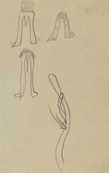 Curator: Immediately, I see a rather ghostly fleet adrift in the off-white sea of the page. Editor: Well, ghostly seems about right, doesn’t it? We're looking at Willem Bastiaan Tholen's "Zeilschepen en figuren in een roeiboot," a sketch dating from the early 20th century, held here at the Rijksmuseum. It appears to be executed in pencil, a quick study of sailing ships and figures. Curator: There’s an almost dreamlike quality here, the bare minimum required to conjure boats and figures, so rudimentary they become universal, recalling ancient trade routes and the symbolic weight of maritime voyages across time. Editor: Observe how Tholen’s swift, sure hand renders the sails as planes of stark white, framed by lines implying shape and shadow, their geometric forms hinting at something just beyond representation. Note that the perspective feels deliberately skewed. It isn't quite the "correct" rendering of the subject, but a rapid study, exploring shapes more than realism. Curator: The repetition lends itself to contemplation on memory and longing. The act of sketching something several times almost feels like trying to capture a fading memory, trying to solidify these transient experiences, doesn’t it? Like archaeology on a single page, each sketch becomes a layer, uncovering and re-interpreting the essence of the subject. Editor: It is tempting to view these types of sketches romantically, but for a moment let's set aside those implications and just examine them as abstract compositions on a page. Each impression has a graphic weight, a balance between dark and light. Curator: Yes, a balancing act that allows each little boat to carry such substantial symbolic cargo: dreams, voyages, journeys into the unknown… a very personal lexicon the artist has allowed us to view. Editor: Ultimately, Tholen provides just enough information for our minds to fill the blanks, the bare minimum needed to create a rather complete image in the imagination. Curator: So, we become participants, not just viewers. I appreciate being invited on such a journey. Editor: Indeed, it is as much our work as it is Tholen’s at this point.