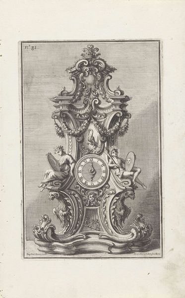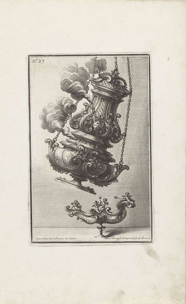 Maximilian Joseph Limpach's "Incense burner with bunches of fruit" is a visual symphony composed of ornate forms and swirling lines. The monochromatic engraving teases out the subtle nuances of texture and depth, drawing the eye into a complex dance of rococo embellishments. The structure is a series of layered, curvilinear flourishes, each element echoing the others in a rhythmic progression. This repetition creates a sense of both movement and balance, even as the asymmetry of the smoke introduces a dynamic tension. Chains hang from the sculpture, disrupting the composition and reminding us of the artwork's functionality. Limpach here engages with the semiotic language of his time, where ornamentation signaled status and sophistication. The incense burner, through its very form, becomes a signifier of ritual and refinement. It questions the limits of representation by exploring how an object can embody both practical function and abstract ideals. Note how the interplay between the solidity of the form and the ephemeral quality of the smoke challenges fixed meanings, and this invites us to consider the transience of beauty and the complexities inherent in cultural symbolism.