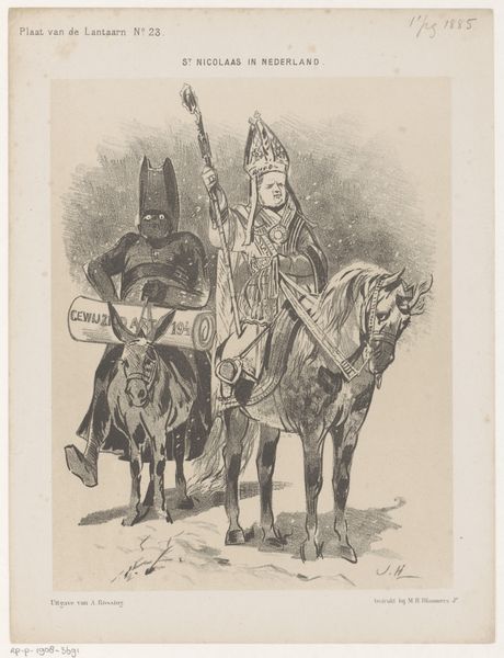 Curator: Ah, here we are in front of "Trompette de dragons," created in 1890 by John-Lewis Brown. What springs to mind? Editor: Immediately? Laborious. Look at the textures, the very visible hand of the artist—not trying to hide the process, but reveling in it. And that horse… looks tired, almost slumped under the weight. Curator: I see what you mean about labor. It's interesting you mention the weight. I find it captures something ethereal, almost a ghost from a past conflict. The artist uses romanticism, but there's a delicate softness there too. Editor: Well, it IS a print, likely lithography given the date and softness you mention. Let's not forget the impact of reproducible images—how prints democratized art. Also consider that brown paper; cheap, functional, readily available. These materials and production tell us much about who this artwork was *for*. Curator: I do wonder, though, if we lose something when we only consider the mechanics. I can get lost in the plume of that red helmet, picturing this trumpeter signaling into some distant landscape. What must that feel like to send music ahead of danger? Editor: What feelings the artist projects are of secondary importance, wouldn't you say, to how readily it was produced for a consuming public? The romance of war? Hardly... what was the economic status of those who could procure images such as this, I wonder. Curator: Maybe. It seems clear that this artwork is a combination of accessible art AND personal statement; and that makes the combination beautiful in itself. Editor: It seems apt we come to such different readings ourselves, as it would surely been recieved. Art lives differently within history. Thanks for that.