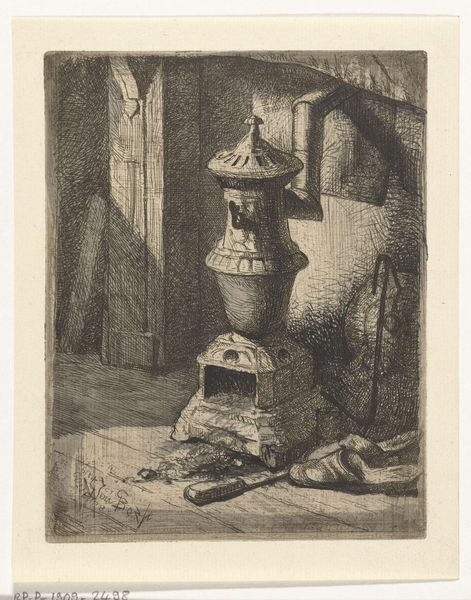 This etching, "Studie van een interieur met kachel" or "Study of an Interior with a Stove", was made by Gerard Jan Bos. Its composition immediately draws us into a domestic space anchored by a stately stove. Bos’s approach to texture and light here creates a sense of depth. The cross-hatching technique builds areas of shadow. Note how this is achieved through the contrast between areas of meticulous detail, and the bare, untouched spaces on the sheet. This contrast animates the image, giving an aesthetic quality that is intrinsic to the printmaking process. The stove sits as a central form, a geometrical structure, with its cylindrical body and ornate top. Bos renders it with detail that speaks to its physical presence within the room, acting as a central anchor within the print. The stark formal elements of the etching technique give the work its aesthetic appeal. This everyday scene turns into a complex interaction between light, shadow, and texture. It captures not just a space, but also the quiet, unassuming beauty found within our daily lives.
