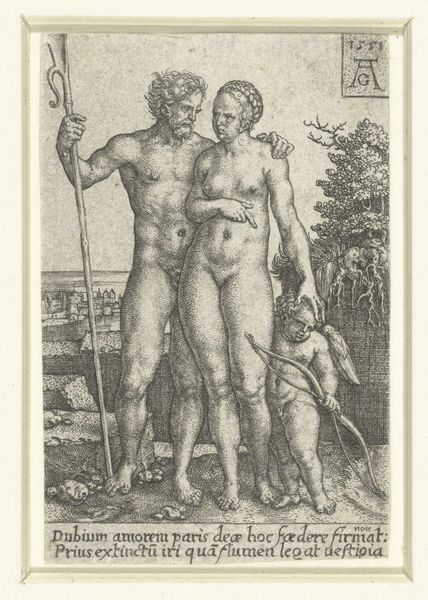 Editor: This is Dirck Volckertsz Coornhert's "Adam and Eve," an engraving from 1551, currently housed in the Rijksmuseum. What strikes me is the almost sculptural quality of Adam and Eve themselves, but I am unsure how to connect that observation with the scene and overall piece. What's your read? Curator: A fitting observation, actually! It's impossible to divorce this work from its historical context. Think about the Reformation brewing at this time, challenging established institutions and demanding a return to origins. Consider how this scene would resonate with those seeking to re-examine faith. Editor: I see, the image gains more importance through the lens of religious transformation. Is there more in terms of its place in art history and reception, especially considering its style? Curator: Precisely! The Mannerist style, with its distorted proportions and dramatic poses, was very much in vogue, often serving to display an erudite artistic knowledge, which reflected a sense of learnedness back to the patrons, the audience and even the location the art inhabited. Editor: Fascinating! It’s a confluence of religious upheaval and artistic performance. Curator: Yes, the engraving’s distribution also speaks volumes. Prints made the narrative accessible. Would you agree this re-contextualizes the artwork, its meaning, reception, and purpose? Editor: Absolutely! The choice of a reproducible medium democratizes access to this scene and adds new layers to interpretation beyond pure artistic merit. This print highlights an intent that ties to an historical movement. Curator: Exactly, and remembering the socio-political moment surrounding its distribution enriches our modern understanding, too. Editor: Thanks, this gives me a totally different insight on it, beyond just admiring the rendering of the figures.