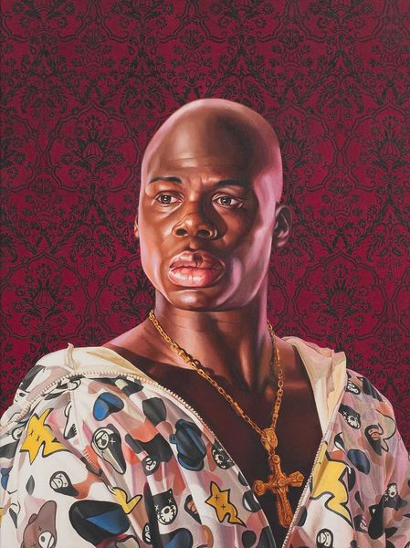 Kehinde Wiley made this striking portrait with oil on canvas. Wiley's work often places Black men and women in the visual vocabulary of traditional European portraiture, inviting us to consider questions of race, power, and representation. In this piece, we see Kern Alexander set against a backdrop of decorative patterning, reminiscent of wallpaper or textiles, which flattens the space and emphasizes the figure's presence. Wiley draws on art-historical references, echoing the compositions and poses of aristocratic portraiture. This image, likely painted in the early 2000s in the United States, challenges the historical absence of Black figures from such spaces. By inserting Kern Alexander into this tradition, Wiley confronts the established art historical canon, questioning who gets to be seen, how, and why. To fully appreciate the nuances of this work, delve into studies of the history of portraiture and the social context of contemporary art, paying particular attention to the historical presence of Black people in art. The meaning of art is always contingent on its social and institutional context.