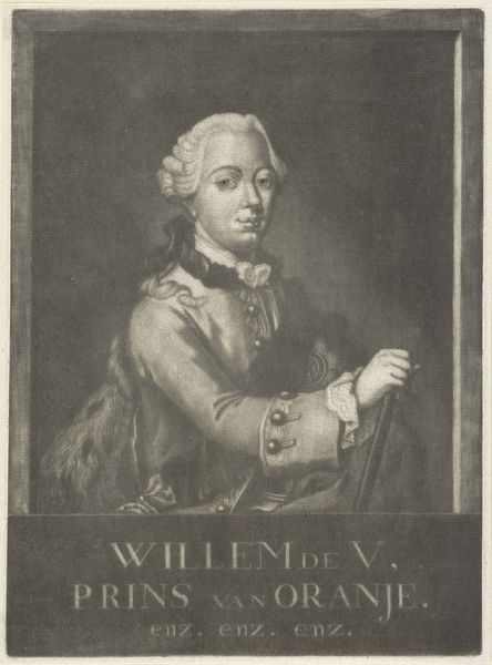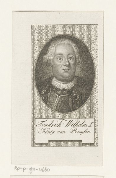 Meno Haas created this portrait of August Willem van Pruisen using engraving techniques. The composition is tightly framed, dominated by an oval portrait set against a rectangular backdrop filled with dense, linear patterns. This contrast creates a visual tension, a play between organic form and geometric abstraction. Haas masterfully uses the engraving technique to render textures, from the delicate curls of the wig to the intricate details of the Prince's attire. The portrait, with its formal pose and detailed rendering, embodies the values of representation and social hierarchy. Yet, the surrounding geometric pattern destabilizes the established meanings of the portrait, challenging the fixity of representation and suggesting an underlying structure. Ultimately, the engraving is not just a representation of a person, but a complex interplay of signs, a structured composition that invites ongoing interpretation.