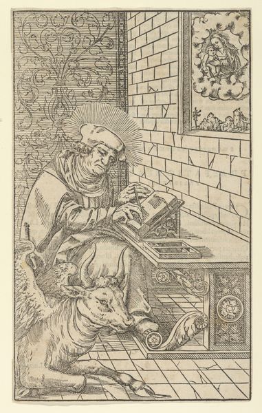 Curator: This is Albrecht Durer's "St. Jerome," created around 1492. It is a striking print. Editor: My first impression is the incredible detail. The textures are almost palpable, especially the rendering of the lion’s fur and Jerome’s garments. The whole scene feels very intimate and concentrated. Curator: Durer's skill with the burin is definitely on display. We see it here in the density of lines, creating such varied tones. The materials available to artists like Durer – the quality of the paper, the sharpness of the burin, even the available light in the workshop - profoundly shaped these works. The ability to create and distribute printed images democratized artmaking in a way that hadn’t been possible before. Editor: Absolutely, the print medium itself carries its own historical weight. Think about the socio-political context. The late 15th century was a time of immense religious and intellectual upheaval, the dawn of the printing press. Images like this, distributed widely, helped to shape the visual culture and devotional practices of the period. Look at the arrangement of the study, the symbols and layout carry the historical weight of Jerome as translator. Curator: Notice also how he uses the space. The careful placement of tools, books, and objects really highlight St. Jerome's profession and working conditions. Even something as seemingly simple as the type of paper would have impacted the final result. Access to certain pigments would also play a major part of artistic consideration. The print medium and the means to generate printed information held social influence during the period, for the people in power who wished to promote propaganda. Editor: Yes, the symbolism is rich, reinforcing his role and message! The inclusion of the lion, of course, speaks to the story of Jerome removing a thorn from the lion's paw, cementing the idea of wisdom, compassion, and control over the animal, symbolizing base human instinct. It suggests how religious icons were used, what sort of political imagery became normalized during this historical period. Curator: Considering that it's printed, we might also want to think about who was consuming these images and under what conditions. How were they sold and circulated, how were they displayed in homes? These processes of consumption ultimately give new layers to meaning-making in addition to original religious intent of this imagery. Editor: This is fascinating work from Durer; thinking through its artistic labor as a symbol, its use and historical symbolism of the period helps us consider artistic merit through a wider cultural and social lens. Curator: Exactly, by investigating both the artistic hand and materials and the wider social influence, we develop a nuanced interpretation that honors Durer's place in art history.