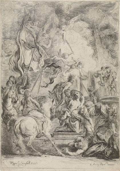 Curator: What strikes me immediately about Cornelis Schut’s engraving, “The Rape of Europa,” made sometime between 1618 and 1655, is the sheer dynamism conveyed through such fine lines. The image teems with figures – both human and divine. Editor: Dynamic is certainly one word for it. My initial reaction is a bit more conflicted. There's a celebration of power, certainly, but also an unsettling undercurrent of forced abduction. The “rape,” or abduction, itself is sanitized, made almost idyllic by the frolicking cherubs. How can we reconcile the seemingly playful composition with the violence inherent in the story? Curator: The engraving captures a pivotal moment from Greek mythology, of course, Zeus, in the guise of a bull, abducting Europa. Looking closer, we see those frolicking cherubs, emblems of love and desire, but notice the composition as a whole? The figures are clustered, interwoven. Is this chaos a deliberate comment on power imbalances? Editor: Exactly. We need to situate this work within its historical context. Europa’s abduction isn’t just a mythological tale; it's been interpreted as an allegory for conquest, domination, and the power dynamics between Europe and other continents. Seeing the engraving, I can't help but read its imagery through a lens of colonial narratives and gendered violence. Curator: Perhaps. The bull itself can be read as a potent symbol, linked across many cultures, but within the framework of the Classical, Zeus's choice of disguise subtly emphasizes deception and the masking of brute force. I can imagine the intended audience recognized those symbolic languages from a range of sources. Editor: Absolutely, and it raises critical questions about how such narratives are constructed and perpetuated visually. How can we grapple with these legacies today, in an age increasingly attuned to the realities of power, colonialism, and patriarchy? Should works like these be reinterpreted and reassessed? Curator: This piece remains powerful, a complex piece that prompts important discussion. Looking closely at the technique here allows one to begin that analysis, to discern some potential contemporary parallels in other works. Editor: Yes. Understanding that visual rhetoric helps to create a contemporary critique is so necessary, a decolonizing and intersectional approach is crucial when exploring a work like this.