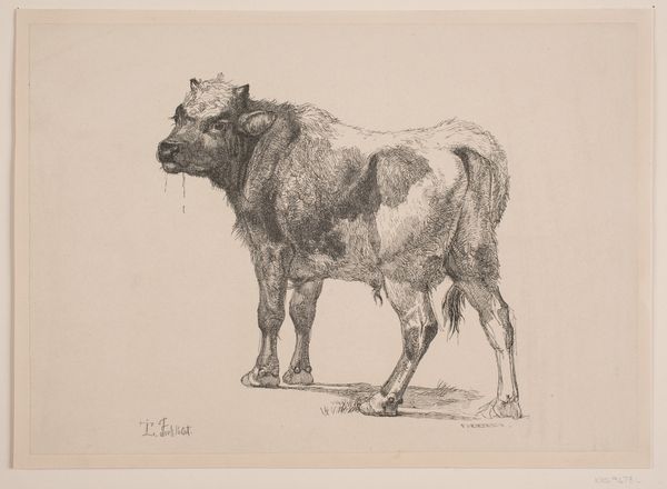 Curator: Looking at this artwork, "Toy Cow on Stand," a watercolor and charcoal piece created around 1937 by James McLellan, I'm struck by its somewhat peculiar presence. Editor: It has a rather subdued, almost melancholic charm, doesn't it? The muted tones and the slightly stiff pose of the cow give it an air of quiet dignity. There's something a little bit lonely about it, too. Curator: McLellan's rendering here is incredibly precise. Note the level of detail on the cow's bell collar, but there's something subtly off too – like the cow is deliberately posed, waiting patiently for someone. The early 20th century saw immense change in society, I wonder if this is in comment about production and expectation? Editor: Definitely, there's a constructed feel about the image. That bell, for example – it speaks to the historical importance of animal husbandry, doesn’t it? In a period with changing industrial manufacturing, it reminds one of tradition and agrarian values. Curator: Yes, it brings into mind a time where agriculture held more political power in American governance. As our country went from agricultural to industrialized nation, art that celebrated the agrarian provided a certain sentimentality. Editor: The wooden base also suggests a curated nostalgia. In what context would you place something on a literal, or figurative stand? Curator: Good question. What is the object in relationship to history and memory. When displayed, this cow sits elevated, preserved, and viewed through an interpretive lens. Editor: Indeed. I find this cow quite captivating, not just as an artifact but as an emotional snapshot. McLellan’s piece invites a rumination about memory, a memory propped up on a stand as well as our connection to cultural symbols. Curator: Agreed. McLellan’s work truly allows us to see how artistic representation acts not just as a visual record but also as a participant in a wider dialogue about societal values.