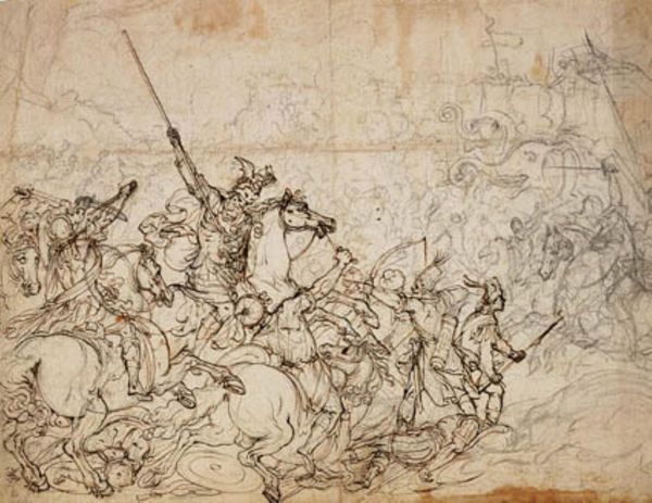 Editor: Here we have Rodolphe Bresdin's "Landscape with Castle on a Mountain." It's a very small drawing, but the linework feels so dramatic. What do you see in this piece in terms of its historical context? Curator: Bresdin worked outside the Parisian art world, producing intensely personal and often bizarre images. Look at the castle itself; it's both a symbol of power and, perched precariously, also of vulnerability. Consider the politics of imagery at the time and how industrialization changed perceptions of the rural landscape. Editor: So, the castle isn't just a castle, it's a commentary? Curator: Precisely. Bresdin's landscapes weren't just pretty pictures. They were often social critiques, hinting at the changing power structures and the idealized vision of the past. Editor: That's really changed how I see it! Thanks! Curator: My pleasure. It’s fascinating how a deeper understanding of the context can unlock so much in a seemingly simple image.