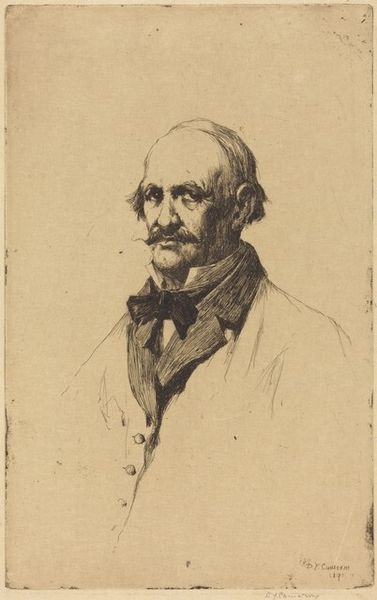 Curator: This is Franz von Lenbach's "Portrait of Bismarck," a striking piece currently housed at the Harvard Art Museums. Editor: It's immediately imposing, isn't it? Despite the delicate use of line and the muted palette, his gaze is quite intense. Curator: Lenbach, known for his portraits of prominent figures, captures Bismarck with a somber dignity, hinting at the weight of his political role. The mustache, especially, is a symbol of authority. Editor: Absolutely. And look at the paper; you can see the tooth. The artist's hand is so visible. How did the paper's texture influence the application of the pigment? Curator: A compelling question! Beyond just technique, Bismarck's image became a potent symbol of German identity, particularly after his death. Editor: It’s interesting to consider how that image circulated. Was this drawing made into prints? What materials would have been used to reproduce it, making it accessible to a wider audience? Curator: Exactly. The portrait is more than just a likeness; it’s a carefully constructed icon of power and national pride. Editor: Indeed. Considering its physical presence and how it was made deepens our understanding of its symbolic power. Curator: A fascinating interplay between materials, technique, and the construction of an enduring cultural symbol. Editor: A fitting testament to the layered stories art can tell.
