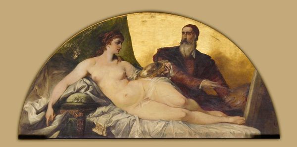 This is Hans Makart's "Michelangelo Buonarroti," which likely dates to the 1870s. It's a historical painting done in oil on canvas, and we can immediately see the artist's deep engagement with the materiality of paint itself. Makart built up layers of pigment to create a palpable sense of depth and texture, from the gold leaf background to the velvet fabric on which Michelangelo's figure reclines. The artist is shown with his tools, presenting a stone block as though it were itself a finished sculpture. The painting revels in the sensuous possibilities of oil paint, celebrating the tactile pleasures of artistic creation. The emphasis here is on the artist's skilled labor, on a high-minded vision brought to life through disciplined craft. It's easy to get lost in the visual qualities of the painting, in the artist’s self-aware portrayal of creative labor. Considering the materials and processes used to produce the artwork allows us to appreciate the level of skill required to produce such a complex and beautiful image. This challenges the traditional distinctions between fine art and craft.