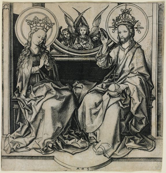 The Master AG must have spent time in the circle around Schongauer. He produced several finely and carefully executed copies of that master’s successful engravings. Among them is the series of 'Wise and Foolish Virgins' (33762–33771) and the depiction of 'Christ Enthroned' seen here. Flanked by angels drawing a curtain aside, the Redeemer performs a gesture of blessing. This engraving may have formed a cycle in combination with the 'Virgins': the 'Wise' to Christ’s right and the 'Foolish' to his left.