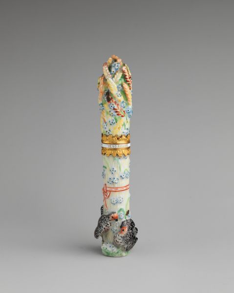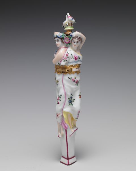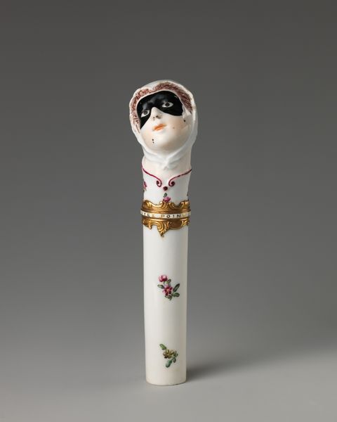 Curator: Let's turn our attention to this striking porcelain piece—a Male Bust created by the Chelsea Porcelain Manufactory, dating between 1760 and 1770. It resides now at the Metropolitan Museum of Art. Editor: Well, my first impression is that it’s quite...precious. Almost absurdly ornate, with that tiny bust atop what looks like an elaborately decorated container. Curator: The form is quite intriguing. Note the careful articulation of the facial features on the bust, contrasted with the more abstracted decoration on the cylindrical body. The rococo sensibilities are really on full display, aren’t they? Look at those swirling gold patterns. Editor: Rococo, yes, dripping with symbolism. A miniature sundial motif prominently featured alongside the bows and floral swags…Time, beauty, and perhaps a nod to the ephemeral nature of both? There is the radiant sun there as well! Curator: Certainly, we see those standard rococo tropes but look at how the artist utilizes the limited palette to create visual interest. The balance between the matte porcelain and the gilded accents provides a layered visual experience. There is definitely intentionality in how the piece manipulates light. Editor: I am fascinated by the sundial though! To me, it suggests a society preoccupied with measuring time, but perhaps also with mortality and remembrance. Plus, to position it directly beneath that extravagant bow…It's an interesting tension. Curator: A clever compositional tactic. Note too, how the scale shifts so drastically between the figurative bust and the abstracted designs below. It creates a sense of visual play. The gilded filigree that joins the head to the container functions almost like a visual hinge, drawing attention to this proportional game. Editor: Ultimately, it is about beauty, isn’t it? A beautiful, perhaps fragile object intended to spark contemplation. Thinking about its cultural context of time, what narratives did it try to conjure for its owner? Curator: Precisely. It’s the interplay of form and decoration that holds our interest. A dialogue created within the constraints of a small, ornamental piece. Editor: And those conversations echo even now as we unpack its various layers. It's a surprisingly resonant piece, wouldn’t you say?