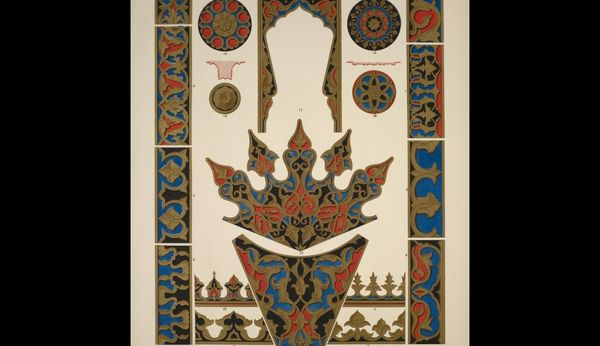Curator: "Turkish No. 1," created in 1856 by Owen Jones. It’s a graphic print showcasing a range of decorative motifs rooted in Islamic art. The work epitomizes the broader Orientalist movement of the time. Editor: The intricacy is striking. There's a harmonious layering of geometric shapes and vibrant colours—blue, red, gold—creating this elaborate, almost hypnotic pattern. Curator: Jones was hugely interested in the cultural context behind ornamentation. His patterns were drawn from his travels in Egypt, Spain, and of course, Turkey. Jones saw decorative art as reflecting broader cultural values. These visual motifs weren’t just aesthetic, they encoded historical narratives of exchange and power. Editor: Absolutely, there’s definitely an argument to be made for appreciating them as visual signifiers first. Consider how Jones uses repetition. He meticulously arranges abstract forms, achieving both symmetry and a kind of visual rhythm. How might we unpack the underlying structural principles at play? Curator: Precisely. Jones, despite the visual splendor, had some blind spots shaped by his historical and colonial contexts. For instance, "appropriation" is an appropriate word to employ here. As a cultural outsider, what was his actual depth of understanding? Or how were these designs then co-opted, stripped of their original significance in British aesthetic theory? Editor: I concede. Perhaps my semiotic impulse overlooks crucial sociopolitical readings of decorative Orientalism as a symptom of the Empire. Still, though, I find myself in awe of the sheer technical expertise shown in this image and that can be divorced from this somewhat. Curator: A balanced point. These sorts of questions are central to unlocking deeper insight. Appreciating it within the frame of design and cultural legacy enables new understandings of Jones’s work. Editor: Indeed, thank you for elucidating both sides of a really rather lovely design!