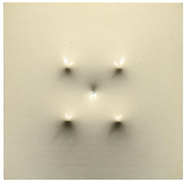 Dadamaino made this monochrome painting, 'Volume' with what appears to be acrylic on canvas. The iterative process of layering paint is on full display here, and the approach to painting is a careful, considered, and almost mathematical one. Each of the four white lozenges hovers in its own space, an effect achieved through subtle gradations of tone. I keep thinking about the relationship between figure and ground, how each shape interacts, and how each individual form relates to the bigger picture. There is such dynamism in this piece. It’s a still life that really moves! Looking at the piece, I'm reminded of Giorgio Morandi. Both artists share this ability to extract the extraordinary out of the ordinary, and to find space for individual gestures within a predetermined formula. The magic is in the variation.
