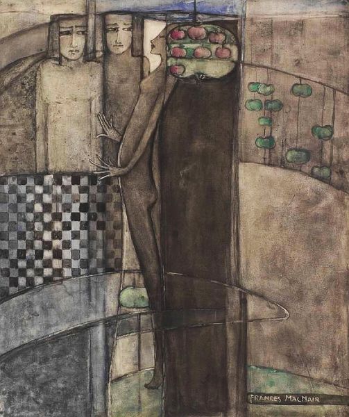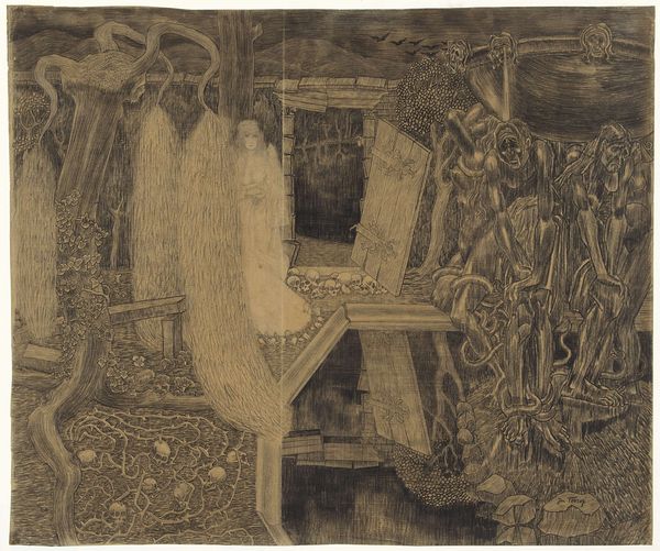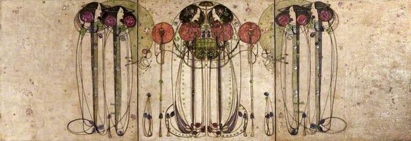 Editor: This mixed-media piece, created by Charles Rennie Mackintosh in 1917, is titled "Wall Panel for the Dug-Out." Its intricate lines and delicate washes give it an ethereal, almost dreamlike quality. The blend of the figurative with what feels like architectural design strikes me as unique, maybe even a little haunting. What do you see in this work? Curator: Haunting is a brilliant word for it, actually. To me, it's like glimpsing a half-remembered fairytale, something both beautiful and vaguely unsettling. The muted colours, mostly watercolor and drawing, create this strange world. It’s definitely rooted in Art Nouveau, you can feel that elegant curve. Mackintosh here seems to be less concerned with representing the world around him, and more with capturing the essence of, shall we say, an interior world. The “Dug-Out” space it was created for seems to lend a melancholic air... don’t you feel it? Editor: I can see that. I hadn't thought about the context so directly, but you're right, the palette definitely leans into that mood. I’m intrigued by the symmetry too. What's its role here? Curator: The symmetry, yes! It brings a sense of order and control to an otherwise rather dreamlike scene. This play of order and fluidity is key, isn't it? Like trying to make sense of a feeling... It feels a little sacred doesn't it? Editor: Absolutely, especially with the verticality and repetition. This has been so interesting, highlighting layers that I missed before. Curator: And for me! Sometimes, another pair of eyes brings it all into brighter light.