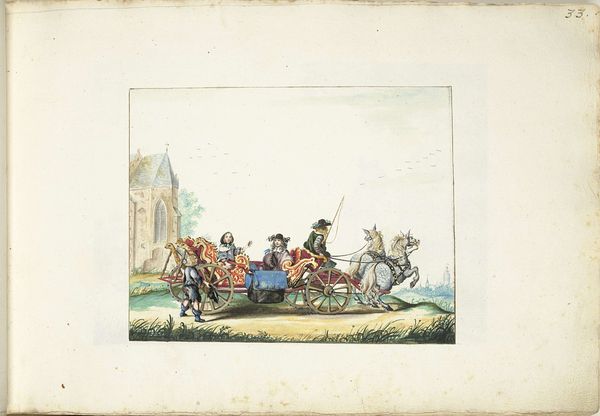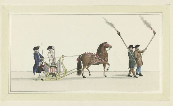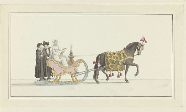 Curator: Here we have "Vijfde slede", or "Fifth Sleigh," a watercolor by Abraham Delfos, dating back to 1776, and residing here at the Rijksmuseum. Editor: Oh, what a whimsical winter parade! I adore how delicate the watercolor feels, like a fleeting dream on a frosty morning. Curator: Rococo is practically dripping off this illustration. Think about the cost involved: the dyes for the watercolour, the skilled labor required to create it, and then the social context that allows this sort of opulent display of leisure. It tells a story of economic privilege made visible. Editor: Yes, all that pomp and circumstance! But look at the horse, pulling that extravagant sleigh – it's not just an animal, it's practically wearing a chandelier! Imagine the clatter of hooves on cobblestones, the brassy blare of those trumpets, as everything jingles! Curator: Consider the historical function too. These "genre" scenes provided social commentary. Did it document or idealize the sleigh parade culture? Its very existence points to certain networks of patronage. It raises questions of labor and class. Editor: Precisely! But I can't help feeling a sort of nostalgia. Even as a social performance, there’s something genuinely charming about the way these figures, captured so crisply by the watercolour, seemed poised on the brink of laughter and maybe some mischief. Curator: Agreed. Ultimately it's more than mere Rococo fluff. Delfos' use of watercolour transforms a momentary, performative parade into a durable record of status and aspiration within 18th-century Dutch society. Editor: What began as fleeting winter joy now provides insights into a complex world. It gives pause, no matter the initial burst of whimsy.