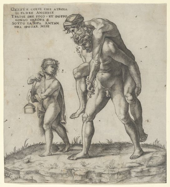 Curator: Here we have Giovanni Jacopo Caraglio's engraving, dating from 1515 to 1565, entitled "Aeneas fleeing Troy with his Family". What's your immediate response to it? Editor: Melancholy. Aeneas burdened, the weight visible in his posture. Even the child has a downcast gaze. Curator: The scene depicts Aeneas carrying his father, Anchises, out of the burning city, while his son, Ascanius, walks beside them. This is, of course, a cornerstone of Roman foundation mythology. It's loaded with symbolic baggage! Editor: Absolutely. Aeneas embodies piety and duty. Carrying his father signifies honoring tradition, but escaping Troy also means turning your back on the old order. It highlights the complex choices inherent in founding new societies after devastation, but also patriarchal systems of succession, too. Curator: Yes, there's the literal weight, Anchises represents lineage. Ascanius carries the flame of their heritage, representing hope for the future. Visually, consider the contrast: Aeneas is a powerful, nearly nude figure, bearing his draped father, while Ascanius holds onto a covered relic. These contrasts feel psychologically intentional. Editor: Caraglio made this during the Renaissance, after all. This is a deliberate staging of masculinity, of showing grief and the need for perseverance amidst a political message of building an empire. Note how even their vulnerability in flight serves to emphasize stoicism, sacrifice, and duty in face of disaster. This engraving certainly encourages complex interpretations. Curator: Indeed, by re-presenting this pivotal scene, the artist taps into archetypal narratives of destruction and rebirth. It shows how myths of origin get visually re-entrenched through printmaking technologies like engraving. It definitely evokes the heavy responsibility that cultural memory places on survivors. Editor: Looking closely now, it's intriguing how even with these clearly defined heroic forms, there's still a pronounced fragility conveyed via the shading and the careful etching of each figure. It challenges, I think, the standard idea of Renaissance heroes. Curator: It does make the mythology of the moment less solid, in a way. I see an insistence of the engraving upon a set of enduring ideals of virtue and continuation. Editor: Ultimately, the work is about negotiating legacies. Caraglio prompts us to wonder: what is the weight of history?