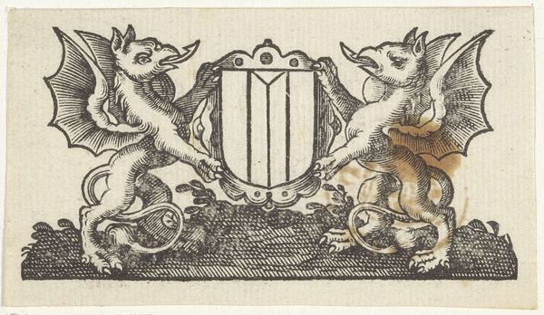 This engraving, *Wapenschild met helm vastgehouden door twee vossen* was created by Nicolaes de Bruyn in 1594. The composition shows a symmetrical arrangement of heraldic elements, dominated by a central shield. The detailed lines create a strong contrast between light and shadow, highlighting the textures of fur, foliage and metal. The use of heraldic motifs and the symmetrical layout is intended to convey a sense of order and tradition. However, the choice of animals, particularly the foxes, introduces an element of ambiguity. In the semiotic system of the 16th century, foxes often symbolized cunning and deceit. Their presence destabilizes the conventional notions of honor typically associated with heraldry. Consider the function of the helmet at the top of the artwork as a signifier of nobility, but also as a literal container of the head. The engraving's meaning lies in its playful juxtaposition of established symbols with trickster figures, inviting us to question the values they represent. The contrast between the formality of heraldry and the subversive undertones of the animal figures offers a complex commentary on power, identity, and representation.