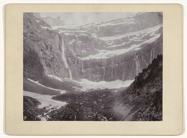 Curator: The sepia tones and stark contrasts immediately give a sense of remoteness and isolation. Editor: Today, we’re exploring a photograph entitled "Gezicht op de Buerbreengletsjer bij Odda," or "View of the Buerbreen Glacier at Odda," captured by Knud Knudsen sometime between 1870 and 1900. I find the composition compelling; there’s a visual journey from the foreground’s rugged terrain to the dominating glacier. Curator: The glacier as a looming symbol of both immense power and fragility, feels particularly relevant to our current moment, given the climate crisis. There's also this persistent Western narrative of exploration and domination over nature that seems embedded here, given how this wilderness is being presented. I also read that women were prohibited from crossing the glacier until late into the 19th century! Editor: Symbolically, ice and glaciers often represent purity and the sublime, yet in Norse mythology, they are intrinsically tied to creation myths, chaos and destruction—which resonates with your take. It would be fascinating to see what Knudsens contemporaries thought about it. Note how small the bridge appears in the landscape, an element he uses to communicate nature’s magnitude. Curator: I’m drawn to consider the labor inherent in this photograph. From the porter who carried the equipment to Knudsen’s own physical effort. These efforts speak to the larger projects of resource extraction and capitalist expansion that often exploit both natural resources and human labor. Editor: Absolutely. These early photographs were a part of cultural projects to shape Norway's national identity too. Viewing these landscapes created and codified perceptions of place. A tangible artifact born from the land itself, rendered visible, its symbolism carries great weight. Curator: Thinking through gender and labour invites critical conversations. I'm struck by how photography has enabled very biased visions of this nation. Editor: Understanding the cultural encoding and what images communicate to later generations... it’s incredibly compelling and humbling to consider.