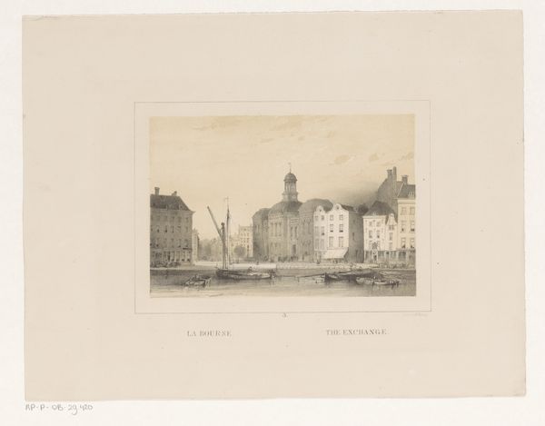 Charles Rochussen created this print, “Gezicht op de Grotemarkt te Rotterdam”, using etching. The composition is structured by a contrast between the ordered architecture of the buildings and the vibrant chaos of market activity, set against a muted palette. The lines of the buildings are sharp and geometrically rigid, establishing a formal backdrop to the scene. Rochussen uses a semiotic interplay of order versus disorder. The artwork, at first glance, seems to simply represent a marketplace, but it also hints at how social structures shape everyday life. The ordered environment contrasts with the unpredictable nature of human behavior, suggesting a structured social framework. The lines and spaces within the architecture serve as boundaries, defining how people interact within the city's public sphere. The buildings are therefore, not just physical structures, but also represent social constructs.
