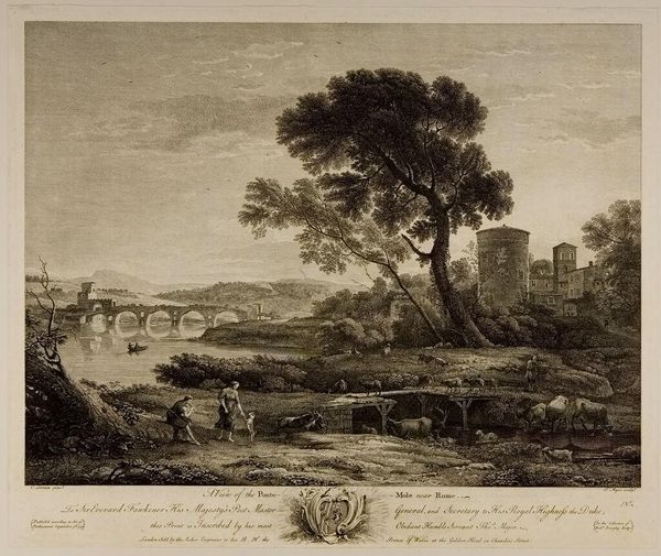 Curator: Looking at William Woollett's "Roman Edifices in Ruins," I'm struck by how nature reclaims grandeur, softening those hard edges. Editor: Yes, there's something elegiac about the scene, but I immediately focus on the labor it would have taken to produce this print. The detail is astounding, considering the etching process. Curator: Exactly! Woollett’s skill is in full view. He captures a kind of melancholy romance; a world that's both lost and ever-present. Look at the light... Editor: And think of the copperplate, endlessly inked, wiped, and pressed. This wasn’t just about aesthetic experience; it was a commercial venture, a circulation of ideas and images of Rome. Curator: Indeed, it makes me ponder how beauty transcends its materiality to speak across time, ruin by ruin. Editor: It's beauty born of labor and intention, yes. A delicate dance between material and image, really.