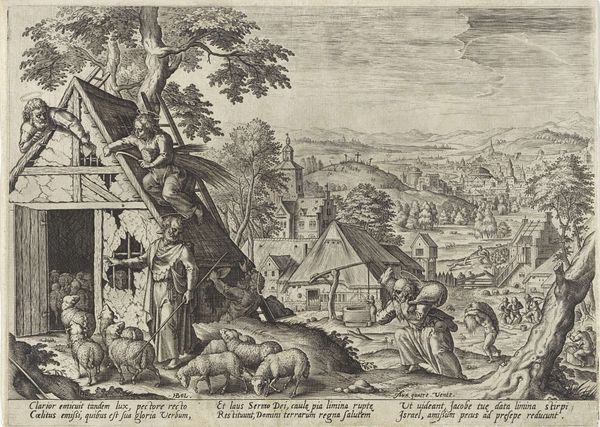 Curator: This engraving, created around 1583 by Johann Sadeler I, is titled "Lamech en zijn twee vrouwen," which translates to "Lamech and his two wives." It resides here at the Rijksmuseum. Editor: It has this unsettling stillness about it despite all the activity; it's a bit haunting in its presentation of domesticity and violence. Curator: Sadeler's Mannerist style certainly contributes to that feeling. Look at the exaggerated figures, the densely packed composition, the play of light and shadow creating almost a stage-like setting. We can read this using structuralism by noting the relationship between the characters and their poses as indicators of inner conflict. Editor: I am far more struck by the means through which this "stage" and "characters" came to life, focusing on its materiality. Imagine the labor-intensive process of creating this detailed image with metal tools and acid. It seems counter-intuitive how much labor had to be deployed to represent something so devoid of apparent labor such as family drama. Curator: Yes, that contrast heightens the effect. From a formal perspective, the linework is incredibly detailed. Observe the variations in stroke weight and direction used to describe the forms and create a sense of depth despite its essentially two-dimensional nature. Note also how Sadeler masterfully contrasts the delicate line work of the foreground figures with the more simplified background. Editor: The socio-cultural implications are also worth exploring here. Lamech's story is rooted in themes of sin and divine retribution; consider how Sadeler used the material process of mass production through printmaking to further distribute interpretations of Biblical history to new audiences. Curator: Precisely. Ultimately, its powerful use of visual language—of contrasting light and shadow, its exaggerated, Mannerist style, and its layered compositional structure—create a deeply compelling and memorable image that engages at once emotionally and intellectually. Editor: Absolutely. From the selection of copper as a base material to its end use as an image in circulation, it makes this a perfect embodiment of art being a product of time and context, forever speaking across them.