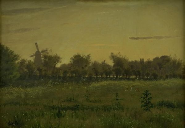 Curator: This is L.A. Ring's "View of Roskilde Fjord, Early Spring," painted in 1903. It is an oil-on-canvas landscape. Editor: A study in stillness, wouldn’t you say? That expansive sky presses down, creating an almost suffocating calm. It makes me a little uneasy, to be honest. Curator: Interesting, considering Ring's social realism often explored the lives of the rural poor and the stark realities of agricultural life in Denmark at the turn of the century. This painting, however, feels deliberately detached. It’s post-impressionistic with a dash of realism, showing a changing countryside at the cusp of spring. Editor: Detached, yes, that's the word! The landscape is observed but not felt. I’m thinking about the romanticizing of nature versus the brutal, economic dependence people had on the land. Is this a political commentary? A commentary on class divisions perhaps? The workers are off-canvas. Curator: Precisely! The absence is telling. The painting doesn't explicitly depict labor, but its effects are everywhere. Look at the cultivated fields, the suggestion of a town in the distance. The bare trees are a reminder of what once was and what will soon come with Spring, reflecting an intersection between romantic ideals and socio-economic changes. It is as if we are in some in-between place. Editor: So the serenity is deceptive, a mask over potential turbulence. This reading helps, and I begin to notice the way the subtle tonal variations contribute to this mood. The pale blues and greens of the sky mirroring the fields below, hinting at interconnectedness. It’s skillfully rendered in what seems like plain sight. Curator: I think examining the institutional history provides context. Ring was well aware of how these landscape paintings would be viewed. The elite had idealized landscape, it was the artist's job to explore deeper, but without the elite actually noticing this. It seems like he managed to achieve that by painting beauty. Editor: Thanks for bringing the piece's sociopolitical significance into view. I now read a quiet tension into the composition and, in that quietness, a certain power. Curator: I am left thinking about the image as more than a beautiful landscape. We could explore much more of its layers.