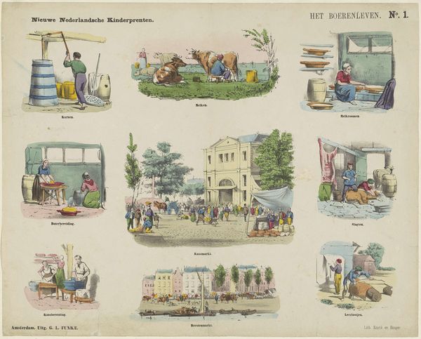 George Lodewijk Funke created this print, "Het Boereleven (II)," depicting rural life. The images showcase agricultural processes such as milking, cheese making, and sheep shearing. These scenes, seemingly simple, are laden with symbolism. Consider the motif of the market, ‘veemarkt’ and ‘kaasmarkt’: the gatherings in the town squares call to mind ancient agoras, where the exchange of goods also fostered cultural and social bonds. Markets, depicted through time, are symbolic of collective memory, echoing in the present. The humble act of sowing, ‘zaaijen’ transcends mere agriculture, taking on the mantle of creation and hope, echoing images of Demeter, the goddess of agriculture, whose sorrow brought winter upon the earth, until her daughter Persephone returned each spring, and the land was fertile again. This print is not merely a representation of rural life; it's a cyclical narrative, a perpetual return of symbols that engage our subconscious, reminding us of the eternal rhythms that bind humanity.