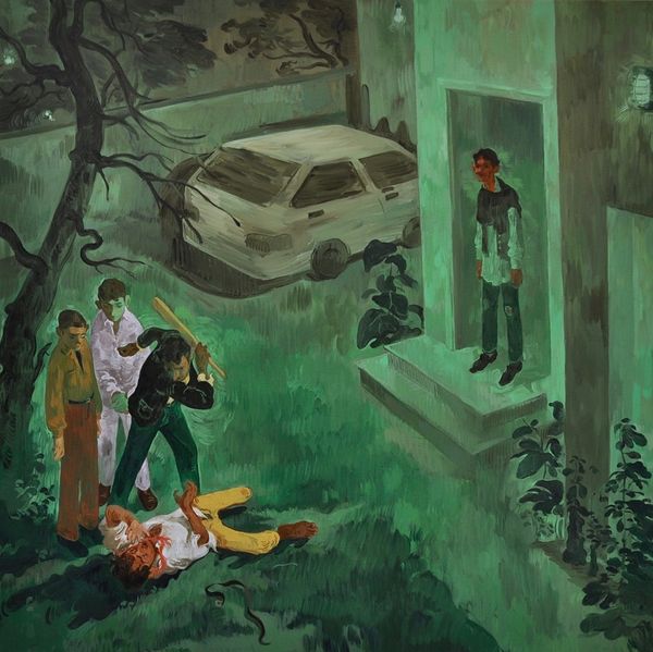 Zoe Hawk's 'Murder Ballad' is a painting with an eerie sensibility, employing gouache to achieve its smooth, matte surface. The paint application is so precise, almost denying the hand, yet the haunting narrative pulls you in. The details are stark, like the axe placed innocently on the stump. Look at the way the pale lavender light filters through the trees, casting an unsettling glow on the figures. Some recline, while another is seated at the water’s edge, her feet submerged, another still rows away. The mood is suspended, pregnant with a story that's both beautiful and deeply unsettling. The artist orchestrates a symphony of muted tones, creating a landscape that feels both dreamlike and foreboding. This picture reminds me of Paula Rego's work, in that it holds a dark, fairy-tale-like quality, where something is brewing beneath the surface of a seemingly simple scene.