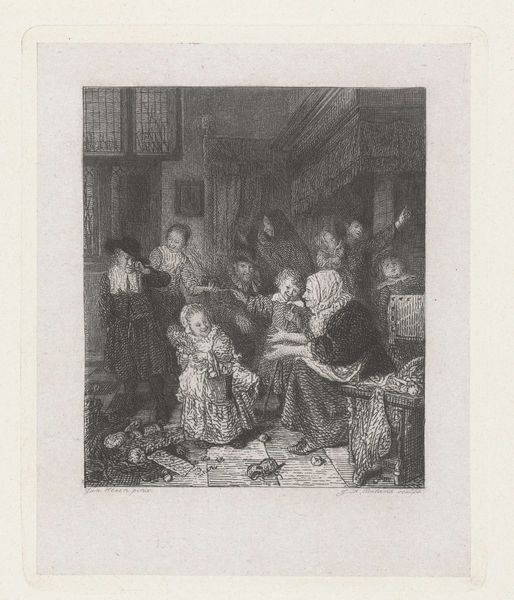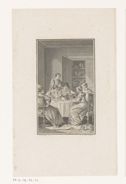 Editor: This etching by Daniel Chodowiecki, titled "A Boisterous Company in a Brothel" from 1787, seems…chaotic. There’s a crowd crammed around a table, overflowing with food and what seems like reckless abandon. It feels almost theatrical, like a stage set for social commentary. What do you see in this piece? Curator: Beyond the initial impression of chaos, I see a snapshot of 18th-century societal anxieties and power dynamics. The setting immediately signifies a space outside the control of the patriarchal family, a zone of female commerce and perhaps, resistance. Consider the figures themselves. Who holds power in this scene? Editor: Well, there seem to be figures with wealth since it appears expensive with fine food and many attendees? But that said the women seem to be in charge in a strange way Curator: Exactly! The artist seems invested in a critical look at gender roles within this space. The act of depiction itself, and for whom, also must be examined. Do you think this image merely titillates, or might it also function as a form of social critique, perhaps challenging normative representations of women and their roles in society? Editor: It's definitely more complex than just simple voyeurism. I see now the contrast between the energy of the women and the passivity or indulgence of the men; a lot is implied by those expressions and gestures! The work invites you to think more deeply. Curator: Precisely! And how this narrative relates to issues that have impact today is important to address: societal norms, equality, power structures... Art from the past, after all, continues to engage with our present. Editor: I learned a lot more than just what is literally pictured here. I can definitely dig a bit deeper now into Baroque styles and art with societal contexts.