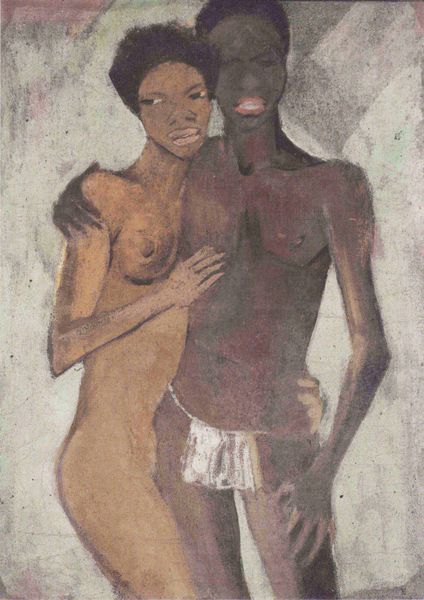 Curator: Kim Dingle’s "Black Girl Dragging White Girl," painted in 1992. It’s oil and acrylic on canvas. The title really grabs you, doesn't it? Editor: Absolutely. My first impression is…uncomfortable. There’s something unsettling in the implied violence, but also in the depiction of children. They are in frilly white dresses, and the setting, a simple brown background, intensifies the raw emotion, wouldn't you say? Curator: It's as if we're looking at a staged scene. These aren’t your sweet, innocent little girls; they seem to be engaged in this battle for power and control, maybe echoing societal dynamics? I always found that so fascinating: using children to talk about such complex subjects. The smeary strokes are kind of gorgeous. Editor: Right, it pulls in those neo-expressionistic themes, challenging idealized images of childhood. It invites reflection on race and class. There’s also an inherent question of female agency. Are we meant to see the Black girl as dominant, or are we dissecting a power structure born from the historical context of racial oppression, inverting the typical depictions of children, and girlhood, as these beings needing constant protection and who are always seen as being very "good"? Curator: Yes! I love that duality! Are they playing? Is it serious? That ambiguity lets your mind fill in the narrative, makes it feel more visceral. Even the unfinished quality heightens that sense of something raw and immediate. What a weird fever dream that evokes so much tenderness and rage. It really tickles my brain! Editor: This deliberate tension between sweetness and aggression serves to reveal the ways in which these power dynamics impact children, especially the bodies and self-awareness of young Black girls, from such a young age. A question Dingle's work asks that can be extrapolated to how contemporary visual media often flattens and misrepresents Black girlhood. Curator: I feel that it becomes a metaphor, a playground for the adult themes. Editor: Ultimately, Dingle pushes us to reflect on who benefits from childhood innocence, and how concepts such as race or power inevitably shatter it. Curator: Yeah! These images remain imprinted. Even though sometimes it makes us squirm a little bit in the presence of such tenderness! Editor: It urges a critical viewing—that’s for sure. Let us not accept, or project, traditional power structures into the space of playing.