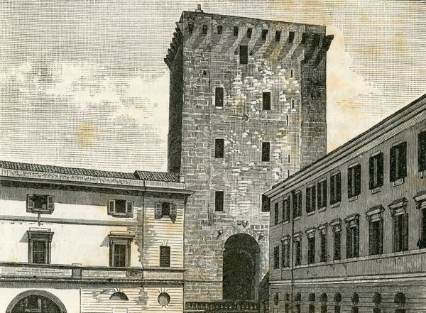 Giuseppe Barberis's *Torre Della Palata*, made around the turn of the 20th century, is dominated by the stark verticality of the tower, immediately drawing the eye upward. The monochromatic rendering focuses our attention on form and structure: the rough texture of the stone, the geometric precision of the clock face, and the crenellated crown. The tower, a symbol of civic order, stands as a rigid marker of time, juxtaposed against the softer, more organic forms of the surrounding architecture. Barberis employs line and perspective to create depth, pulling us into the narrow street and towards the horizon. Yet, the tower remains the central, unwavering element. The graphic quality and stark lines of the print emphasize the inherent tensions between nature and culture. Ultimately, the image leaves us pondering the symbolic weight of architectural forms and the dialogue between time, space, and the observer.