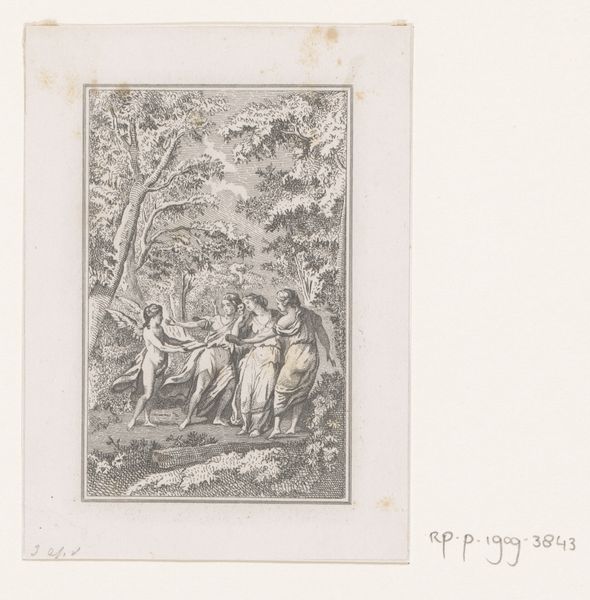 This print, made by Daniel Chodowiecki, dates back to the late 18th century, a period when printmaking was central to the spread of information and visual culture. The image is created through etching, a process involving coating a metal plate with wax, drawing through the wax to expose the metal, and then submerging the plate in acid. The acid bites into the exposed metal, creating lines that hold ink. It’s a relatively indirect process, allowing for fine detail but also requiring careful control. In its own time, etching was valued for its capacity to cheaply disseminate images to a growing middle-class audience. Prints like these weren't just artworks; they were a form of social currency, a way to share stories and ideas, and a product of an increasingly industrialized world of image-making. Appreciating its value involves recognizing its place within the broader context of labor, politics, and consumption.