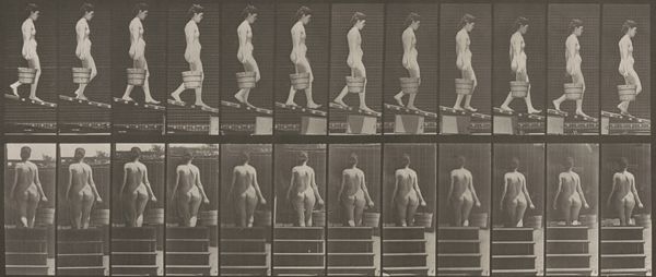 Curator: Here we have Eadweard Muybridge’s "Plate Number 84. Ascending an incline with a bucket of water in right hand," a gelatin silver print from 1887. The series presents a figure in motion, segmented across a grid. My first impression is how systematically Muybridge captured the individual stages, making the image look almost clinical. Editor: It strikes me, too, how this is ostensibly about science, movement, but carries strong undertones of the Victorian obsession with controlling the female body. The female nude subjected to rigorous observation and categorization feels distinctly… surveilled. Curator: Exactly. Muybridge employed a battery of cameras triggered sequentially to freeze these moments. The resulting images provided valuable data for scientific study, and were groundbreaking for motion picture development, of course, but looking through a material lens we have to consider that Muybridge pioneered his methods using both animal and human subjects from varied class and ethnic backgrounds in the Philadelphia and San Francisco areas, with labor and objectification very close to one another here. Editor: Right, we can’t ignore that the power dynamic inherent in the male gaze here. She is reduced to a set of data points in a very limited story arc in service of scientific and artistic "progress." Her agency, her own narrative, is entirely absent from this. What labor was involved and for whose progress? Curator: Think, too, about the labor involved in preparing each print, handling the chemicals, and precisely aligning each image to construct that final grid and what it says about late 19th-century technology and reproducibility. The grid organizes time and action as quantifiable units of labor itself. Editor: I find myself wondering about the sitter’s life beyond these frames. What were her motivations, what were her days like? The lack of contextual information feels like an erasure, reinforcing the detached, objectified reading of this work and speaks to the art-historical treatment of similar women since antiquity. Curator: It is precisely that tension, between objective study and the subjective lived experience, that makes this image so compelling still. And that labor invested from both sides—camera to subject. Editor: Ultimately, looking at the social conditions under which these types of works were developed highlights how identity is constructed and perceived, but also about the ethics of representation then and now, pushing for more nuanced dialogues that go far beyond pure anatomical observation.