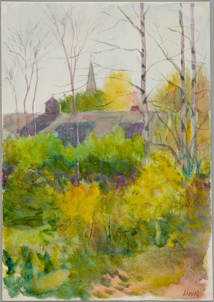 Editor: This is Denman Waldo Ross's watercolor "Landscape." The bare branches in the foreground give the scene such a sense of stillness and dormancy. What resonates with you when you look at this work? Curator: It’s interesting how the skeletal tree both obscures and reveals the building behind it. Bare branches often symbolize death or the end of a cycle, but here, set against the building, might they also represent resilience and persistence? A memory of a past, still standing? Editor: That's a very interesting perspective, and I hadn't thought about the building as a symbol of persistence itself. Thank you. Curator: And thank you, it is fascinating how an image can hold dualities, loss and endurance intertwined.