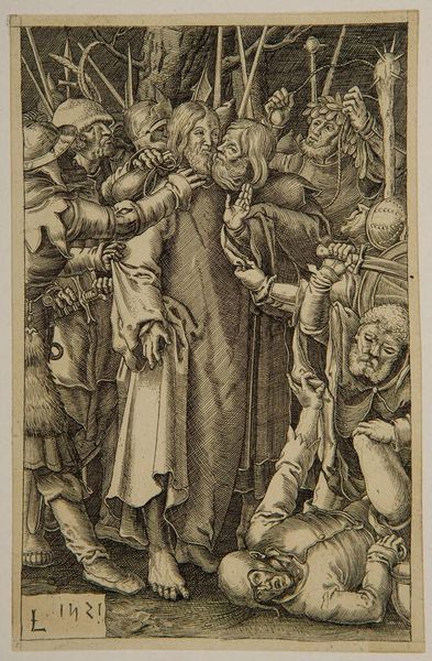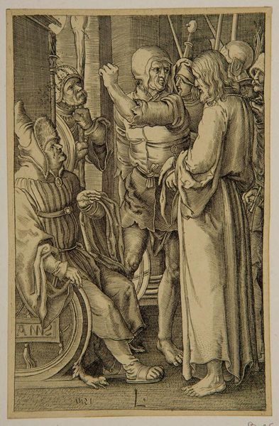 Editor: This is "Saint Christopher," a print by the School of Albrecht Dürer. It depicts a giant of a man carrying a child. The figure seems so burdened. What can you tell me about the cultural significance of this piece? Curator: Well, Saint Christopher is often seen as a protector, particularly of travelers. This image, likely printed and widely distributed, played a role in shaping his public image. Notice how the artist emphasizes Christopher’s strength, visually reinforcing the idea that he could bear any burden. Editor: So, the print itself served to solidify and spread that popular belief? Curator: Exactly. Prints made art accessible and influential in shaping popular devotion. The politics of imagery are fascinating, aren't they? Editor: They really are! I hadn't thought about the print’s role in popularizing a saint like that before. Curator: Considering the social function of art really changes how we perceive it.